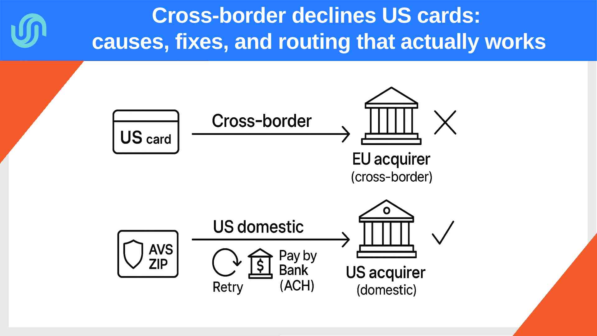 A European online project gets a rush of US buyers… and approvals sag, i.e. cross-border declines US cards: causes, fixes, and routing that actually works. That’s the classic cross-border decline pattern: the issuer sees “US cardholder → non-US merchant/acquirer,” becomes stricter, and says no. The cure isn’t one trick—it’s better data, smarter retry logic US issuers, and (when warranted) local routes or US-native rails.